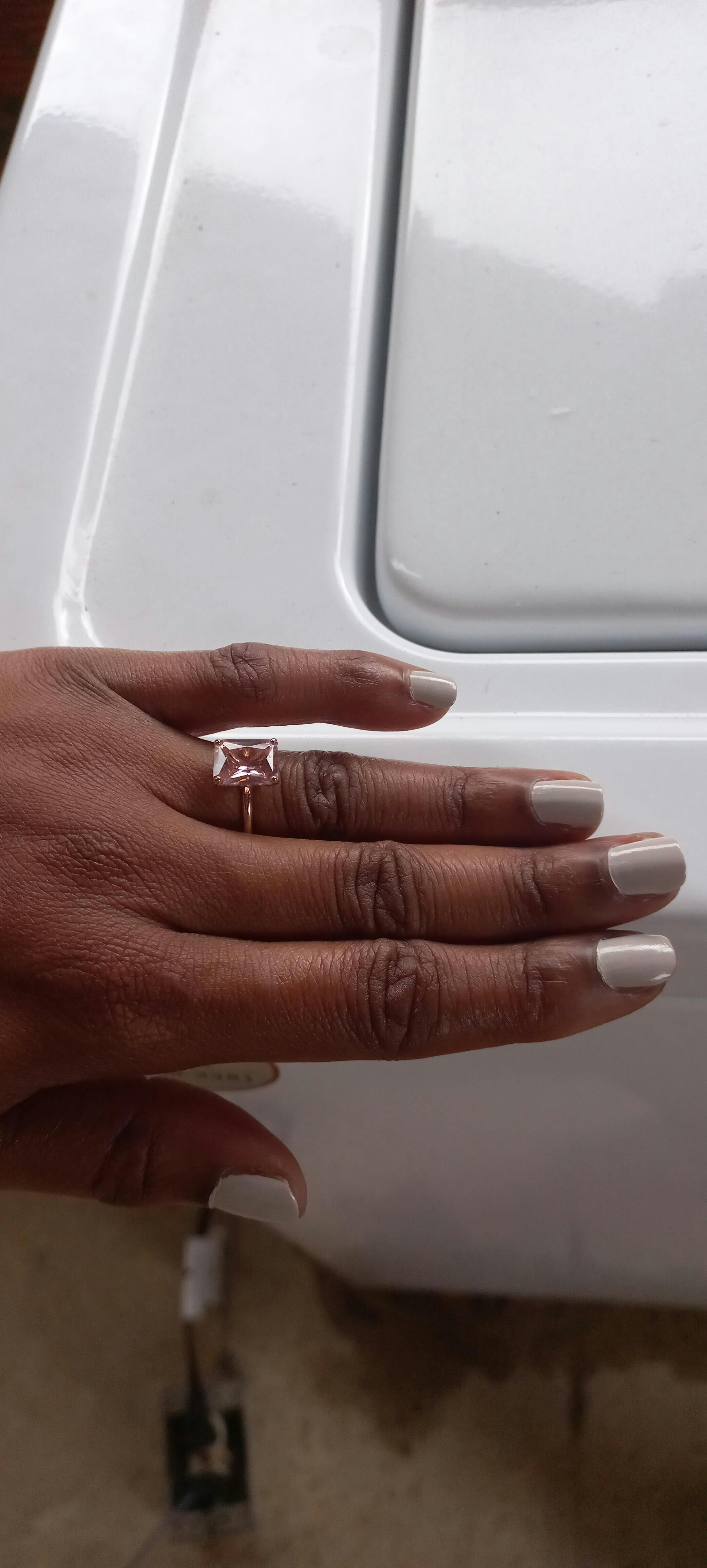 This morganite ring is absolutely breathtaking, an instant showstopper that somehow manages to feel both timeless and modern. The soft blush-peach hue of the stone glows with a warm, romantic light, catching the eye without ever feeling overpowering. It has that rare quality of elegance paired with warmth, making it feel intimate and special rather than flashy.