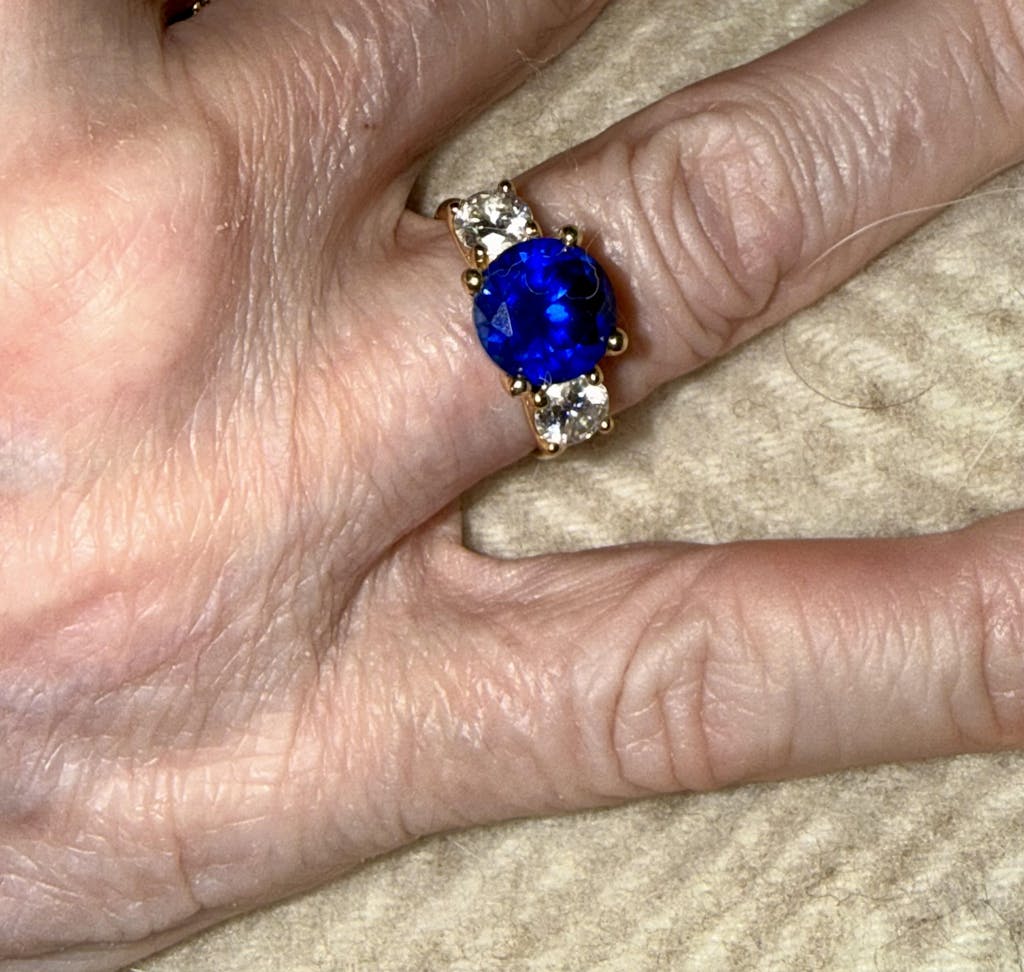 I am absolutely thrilled with this three-stone ring by Scott Bonomo. The 14K setting is beautifully made and feels substantial yet elegant on the hand. The sapphire center stone has a rich, deep blue color that feels timeless and refined, and it’s perfectly complemented by the two moissanite side stones.